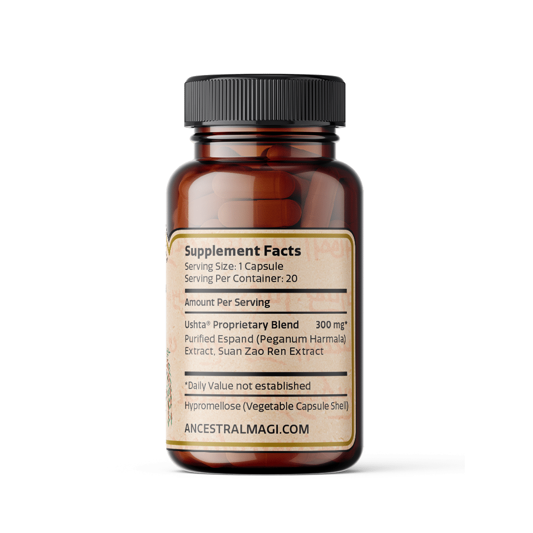 Ushta Mood Boost Supplement is natural stress relief supplement that is formulated with natural extracts of Espand, an ancestral plant that has been used by the Pagan and Zoroastrian priests of ancient Iran in pursuit of otherworldly wisdom and a sublime state of mind; and Suan Zao Ren, an important plant used for more than 2,000 years in the pharmacopeia of Traditional Chinese Medicine. Magi’s team of PhD scientists and ethnopharmacologists formulated Ushta Mood Boost Supplement to provide a safe, effective, and natural mood booster for stress relief.