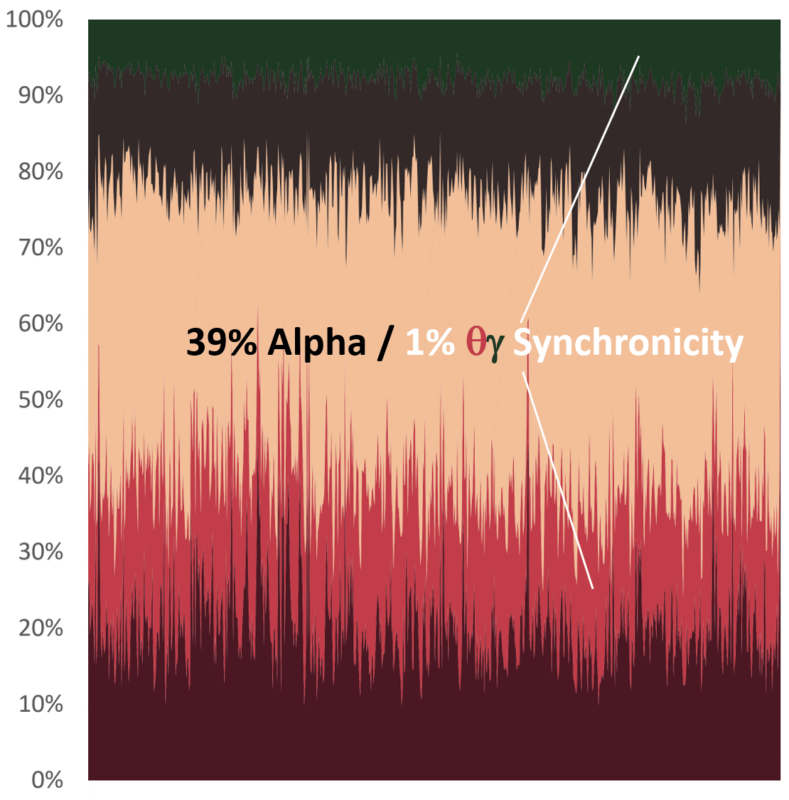 2) Theta-Gamma Synchronicity measured as the correlation coefficient between theta frequency band and gamma frequency band wavelengths across the meditation period